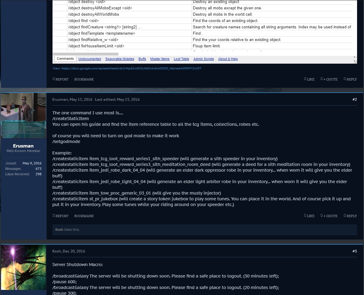 Example: /createstaticitem item_tcg_loot_reward_series1_sith_speeder (will generate a sith speeder in your inventory) /createstaticitem item_tcg_loot_reward_series3_sith_meditation_room_deed (will generate a deed for a sith meditation room in your inventory) /createstaticitem item_jedi_robe_dark_04_04 (will generate an elder dark oppressor robe in your inventory... when worn it will give you the elder buff) /createstaticitem item_jedi_robe_light_04_04 (will generate an elder light arbiter robe in your inventory... when worn it will give you the elder buff) /createstaticitem item_tow_proc_generic_03_01 (will give you the musty injector) /createstaticitem st_pr_jukebox (will create a story token jukebox to play some tunes. You can place it in the world. And of course pick it up and put it in your inventory. Play some tunes while your riding around on your speeder etc.) REPORT BOOKMARKLIKE + QUOTE REPLY Kosh likes this. Kosh Kosh Z'ha'dum Joined:May 8, 2016 Messages:218 Likes Received:34 #3Kosh, Dec 20, 2016 Server Shutdown Macro: