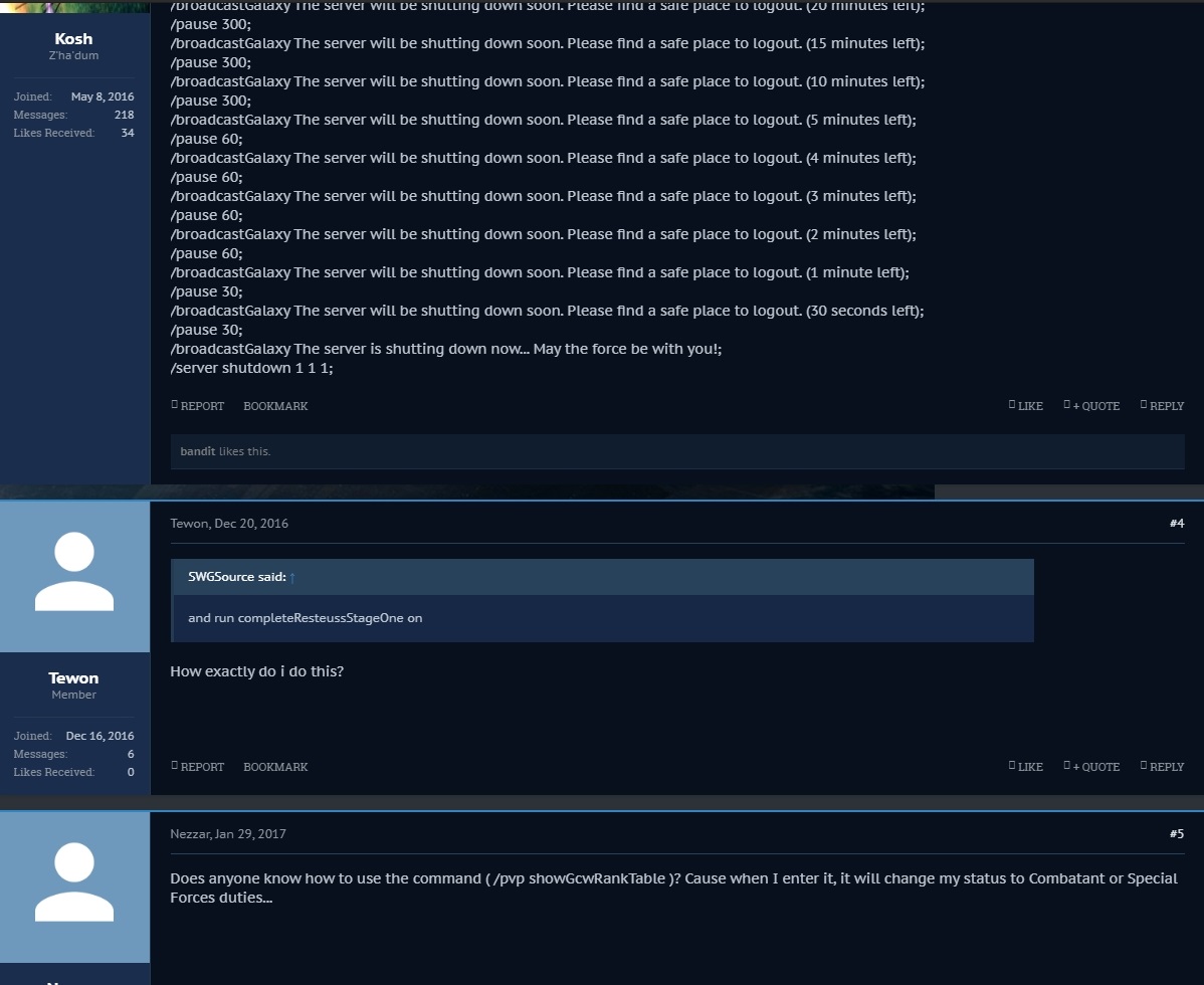 /broadcastGalaxy The server will be shutting down soon. Please find a safe place to logout. (30 minutes left); /pause 600; /broadcastGalaxy The server will be shutting down soon. Please find a safe place to logout. (20 minutes left); /pause 300; /broadcastGalaxy The server will be shutting down soon. Please find a safe place to logout. (15 minutes left); /pause 300; /broadcastGalaxy The server will be shutting down soon. Please find a safe place to logout. (10 minutes left); /pause 300; /broadcastGalaxy The server will be shutting down soon. Please find a safe place to logout. (5 minutes left); /pause 60; /broadcastGalaxy The server will be shutting down soon. Please find a safe place to logout. (4 minutes left); /pause 60; /broadcastGalaxy The server will be shutting down soon. Please find a safe place to logout. (3 minutes left); /pause 60; /broadcastGalaxy The server will be shutting down soon. Please find a safe place to logout. (2 minutes left); /pause 60; /broadcastGalaxy The server will be shutting down soon. Please find a safe place to logout. (1 minute left); /pause 30; /broadcastGalaxy The server will be shutting down soon. Please find a safe place to logout. (30 seconds left); /pause 30; /broadcastGalaxy The server is shutting down now... May the force be with you!; /server shutdown 1 1 1; REPORT BOOKMARKLIKE + QUOTE REPLY bandit likes this. Tewon Tewon Member Joined:Dec 16, 2016 Messages:6 Likes Received:0 #4Tewon, Dec 20, 2016 SWGSource said: ↑ and run completeResteussStageOne on How exactly do i do this? REPORT BOOKMARKLIKE + QUOTE REPLY Nezzar Nezzar Well-Known Member Joined:Jan 27, 2017 Messages:52 Likes Received:2 #5Nezzar, Jan 29, 2017 Does anyone know how to use the command ( /pvp showGcwRankTable )? Cause when I enter it, it will change my status to Combatant or Special Forces duties... REPORT BOOKMARKLIKE + QUOTE REPLY Erusman Erusman Well-Known Member Joined:May 9, 2016 Messages:673 Likes Received:298 #6Erusman, Jan 30, 2017 Nezzar said: ↑ Does anyone know how to use the command ( /pvp showGcwRankTable )? Cause when I enter it, it will change my status to Combatant or Special Forces duties... I haven't used it personally. Be sure you grab the win32 copy and look in the docs. There are a lot of commands in there that could be similar or do the same thing. REPORT BOOKMARKLIKE + QUOTE REPLY Nezzar Nezzar Well-Known Member Joined:Jan 27, 2017 Messages:52 Likes Received:2 #7Nezzar, Jan 30, 2017 @Erusman@Erusman I see.. okay... thanks for pointing me that there is a doc in win32... apologies for not having aware of it... I have been only using your linux build.. REPORT BOOKMARKLIKE + QUOTE REPLY Yarazin Yarazin Active Member Joined:Jan 21, 2017 Messages:37 Likes Received:1 #8Yarazin, Feb 27, 2017 Last edited: Feb 28, 2017 Finally figured it out and it seems to be working. REPORT BOOKMARKLIKE + QUOTE REPLY Bob Bob Well-Known Member Joined:Feb 12, 2017 Messages:97 Likes Received:4 #9Bob, Apr 19, 2017 For the buff commands,what is the command to get them to apply? The one i want to use is... jedi_statue_self_dps_debuff jedi_statue_npc 1 buffs.genericBuff 1200 health 100000 action 25000 The health and action should let me solo my heroics :) REPORT BOOKMARKLIKE + QUOTE REPLY Yarazin Yarazin Active Member Joined:Jan 21, 2017 Messages:37 Likes Received:1 #10Yarazin, Apr 21, 2017 Last edited: Apr 28, 2017 Hi, I could use help on the proper syntax to deplete a resource. I am trying to deplete the current polymer so a new one will spawn.