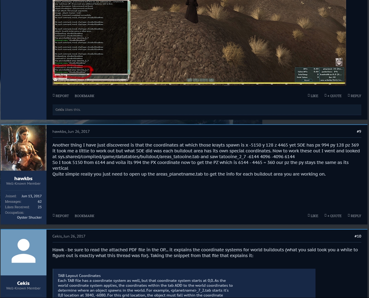 Untitled-1.jpg REPORT BOOKMARKLIKE + QUOTE REPLY Cekis likes this. hawkbs hawkbs Well-Known Member Joined:Jun 13, 2017 Messages:62 Likes Received:25 Occupation:Oyster Shucker #9hawkbs, Jun 26, 2017 Another thing I have just discovered is that the coordinates at which those krayts spawn is x -5150 y 128 z 4465 yet SOE has px 994 py 128 pz 369 it took me a little to work out but what SOE did was each buildout area has its own special coordinates. Now to work these out I went and looked at sys.shared/compiled/game/datatables/buildout/areas_tatooine.tab and saw tatooine_2_7 -6144 4096 -4096 6144 So I took 5150 from 6144 and voila its 994 the PX coordinate now to get the PZ which is 6144 - 4465 = 360 our pz the py stays the same as its vertical Quite simple really you just need to open up the areas_planetname.tab to get the info for each buildout area you are working on. REPORT BOOKMARKLIKE + QUOTE REPLY Cekis Cekis Well-Known Member Joined:Sep 3, 2016 Messages:93 Likes Received:32 #10Cekis, Jun 26, 2017 Hawk - be sure to read the attached PDF file in the OP... it explains the coordinate systems for world buildouts (what you said took you a while to figure out is exactly what this thread was for). Taking the snippet from that file that explains it: