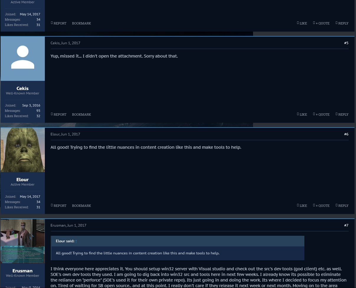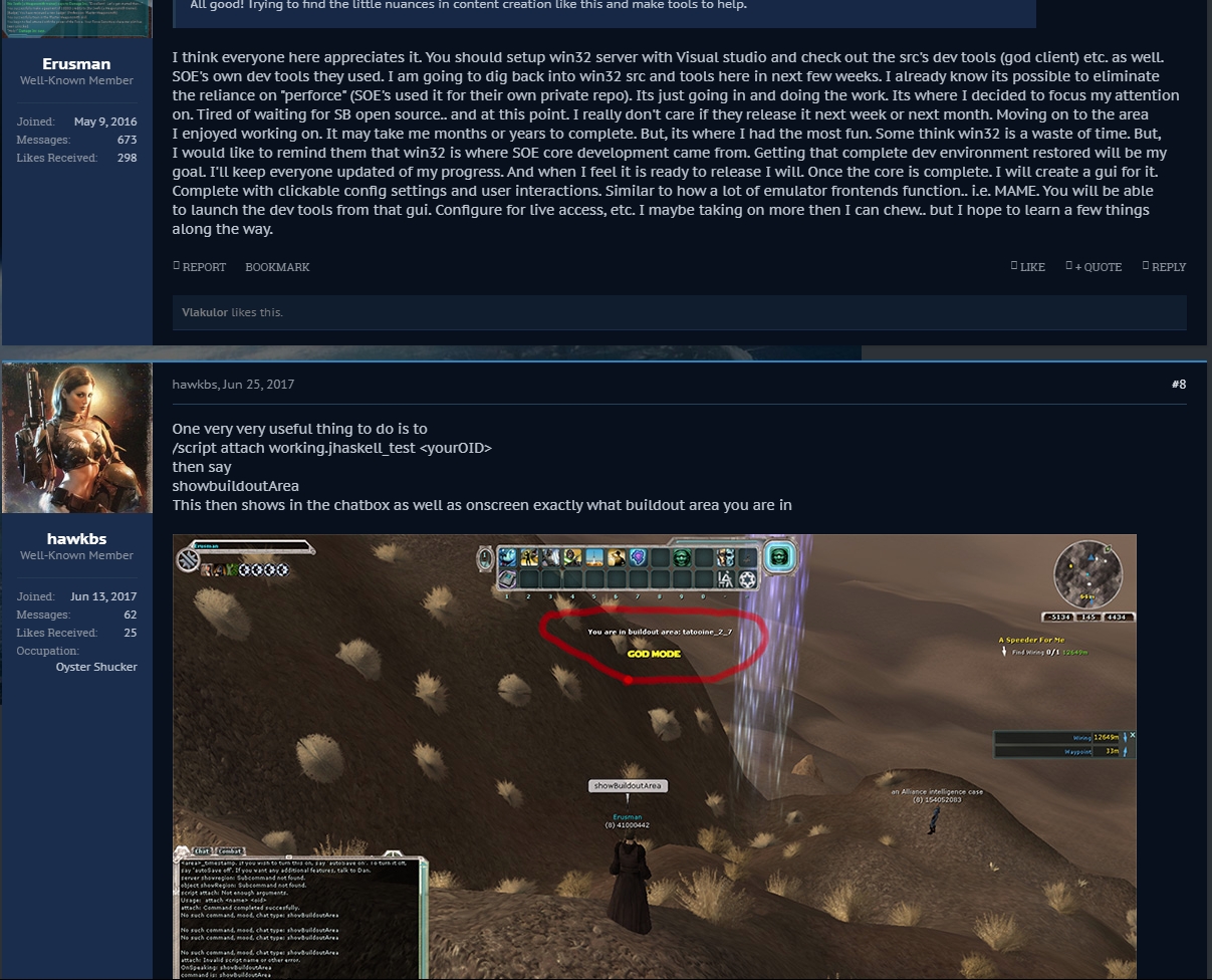 However, if you've built your own utility - share it! I'm sure it's much better than trying to use something online. I struggled with the calculations to convert degrees (yaw) to quaternions so I ditched it and just made the online calcs work for me. REPORT BOOKMARKLIKE + QUOTE REPLY Elour Elour Active Member Joined:May 14, 2017 Messages:34 Likes Received:31 #4Elour, Jun 1, 2017 Yes, for the tables that use qw qx qy qz I have it converting the yaw value you see in game. I attached the zip on the first post. REPORT BOOKMARKLIKE + QUOTE REPLY Cekis Cekis Well-Known Member Joined:Sep 3, 2016 Messages:93 Likes Received:32 #5Cekis, Jun 1, 2017 Yup, missed it... I didn't open the attachment. Sorry about that. REPORT BOOKMARKLIKE + QUOTE REPLY Elour Elour Active Member Joined:May 14, 2017 Messages:34 Likes Received:31 #6Elour, Jun 1, 2017 All good! Trying to find the little nuances in content creation like this and make tools to help. REPORT BOOKMARKLIKE + QUOTE REPLY Erusman Erusman Well-Known Member Joined:May 9, 2016 Messages:673 Likes Received:298 #7Erusman, Jun 1, 2017 Elour said: ↑ All good! Trying to find the little nuances in content creation like this and make tools to help. I think everyone here appreciates it. You should setup win32 server with Visual studio and check out the src's dev tools (god client) etc. as well. SOE's own dev tools they used. I am going to dig back into win32 src and tools here in next few weeks. I already know its possible to eliminate the reliance on "perforce" (SOE's used it for their own private repo). Its just going in and doing the work. Its where I decided to focus my attention on. Tired of waiting for SB open source.. and at this point. I really don't care if they release it next week or next month. Moving on to the area I enjoyed working on. It may take me months or years to complete. But, its where I had the most fun. Some think win32 is a waste of time. But, I would like to remind them that win32 is where SOE core development came from. Getting that complete dev environment restored will be my goal. I'll keep everyone updated of my progress. And when I feel it is ready to release I will. Once the core is complete. I will create a gui for it. Complete with clickable config settings and user interactions. Similar to how a lot of emulator frontends function.. i.e. MAME. You will be able to launch the dev tools from that gui. Configure for live access, etc. I maybe taking on more then I can chew.. but I hope to learn a few things along the way. REPORT BOOKMARKLIKE + QUOTE REPLY Vlakulor likes this. hawkbs hawkbs Well-Known Member Joined:Jun 13, 2017 Messages:62 Likes Received:25 Occupation:Oyster Shucker #8hawkbs, Jun 25, 2017 One very very useful thing to do is to /script attach working.jhaskell_test then say showbuildoutArea This then shows in the chatbox as well as onscreen exactly what buildout area you are in