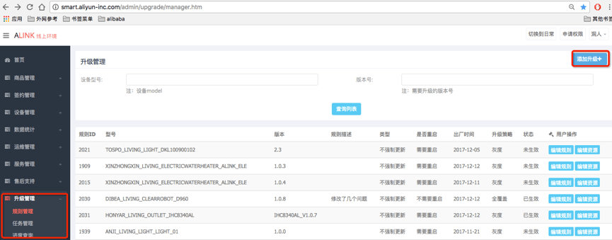 - Open Alibaba cloud platform : http://smart.aliyun-inc.com/admin/upgrade/manager.htm . Find "升级管理-规则管理" in left task bar, and click "添加升级" at the top right corner of the page.