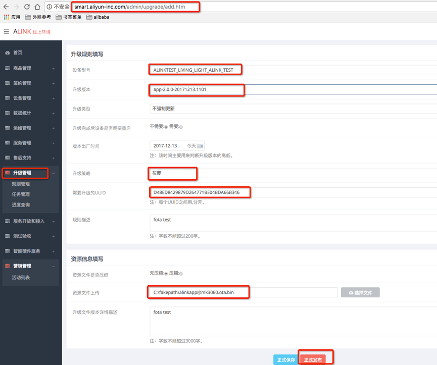 - Upload the newly generated bin file to Alibaba cloud IOT platform: