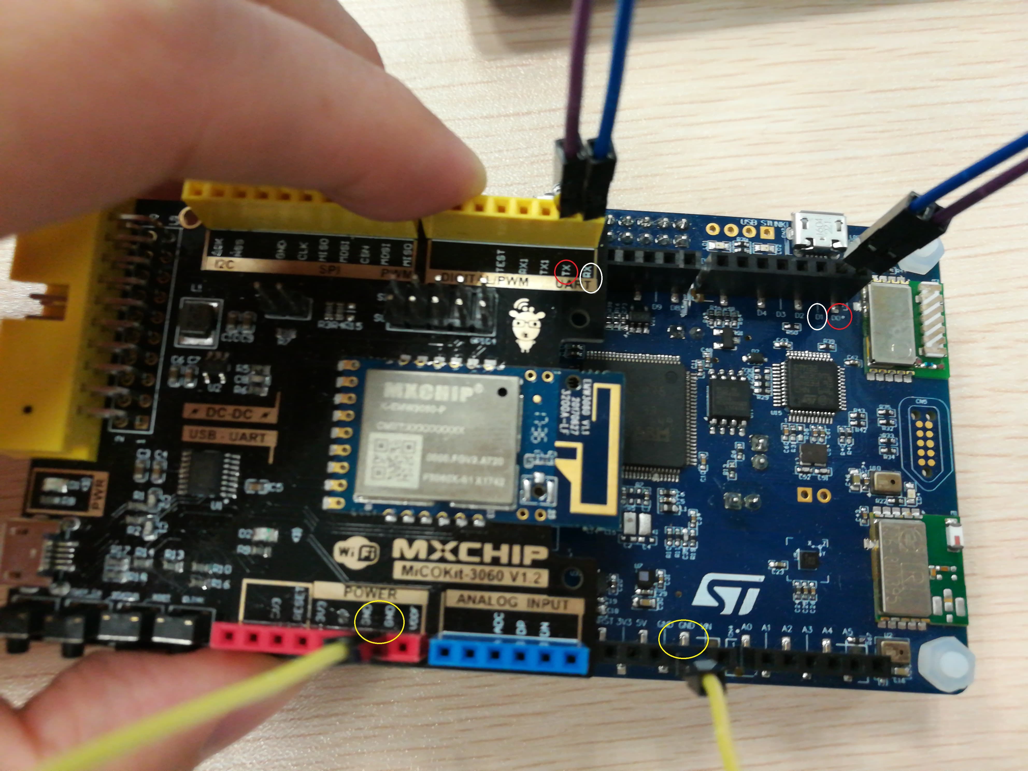 Connect STM32L475 D0 with MK3060 UART TX, STM32L475 D1 with MK3060 UART RX, and STM32L475 GND with MK3060 GND. Detailed way of connection is shown as followed picture: connect the point with same color in two boards with Dupont Line.