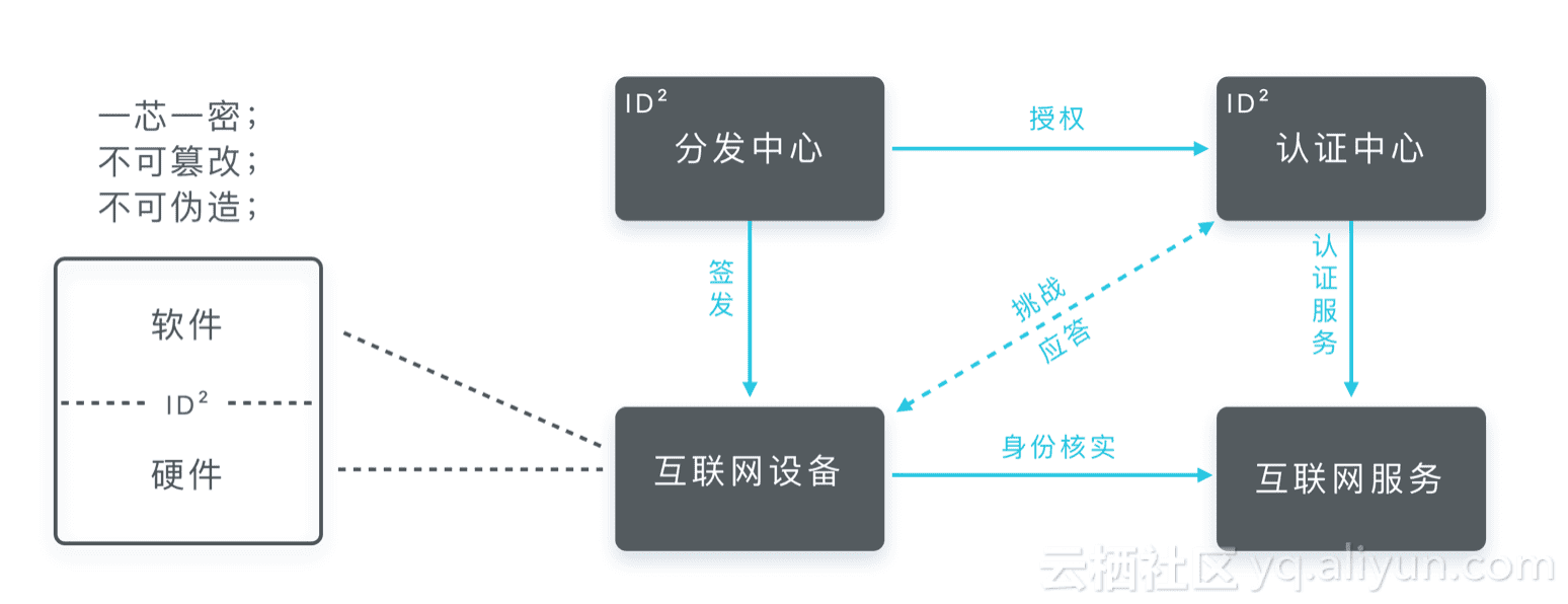 ID² platform is composed of Internet devices, ID² distribution center, ID² authentication center and Internet service. Chips manufactures can request, get and program ID² through SDK. After programing process, API can be called to confirm whether the chips have been successfully programed. Detailed process can be viewed at https://iot.aliyun.com/docs/security/ID2_license_application.html
