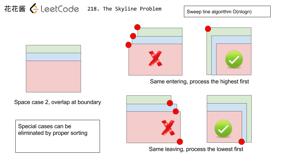 - 该题的思路是:用扫描线算法从左往右扫描每一个渐入点和离开点的横坐标及对应高度,并按x坐标位置从左到右排序。这里使用了一个小技巧,对于渐入点,我们将其高度设为"相反数(负数)",而离开点的高度仍为原来的"正数"。这样在相同的x坐标的情况下,对于渐入点,会先处理高度较高的点,对于离开点,会先处理高度较低的点,从而不会发生天际线扫描的错误。当buildings的位置重叠只是高度不同时,这两种特殊情况可由上述办法解决,具体请参看下图图示: