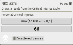 RollTable.create({ name: "Critical Damage", results: rollresults, formula: "1d100" });If you create a valid table with non-compendium critical injuries & damage (described above), you can use this macro. Note that it requires both tables to contain the word "Critical" in order to have the dropdown display correctly. If using a different language or spelling, change the macro to reflect the correct table names.