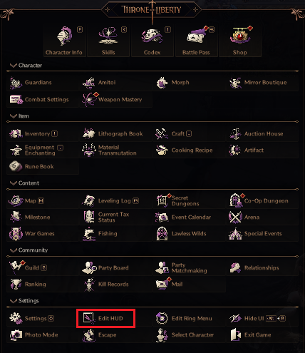 Inside Throne and Liberty, navigate to Main Menu (F11) and select Edit HUD. From there select the Reset button twice. It's also good practice to restart Throne and Liberty after this. This is critical as Thronin is designed to work with the default HUD.