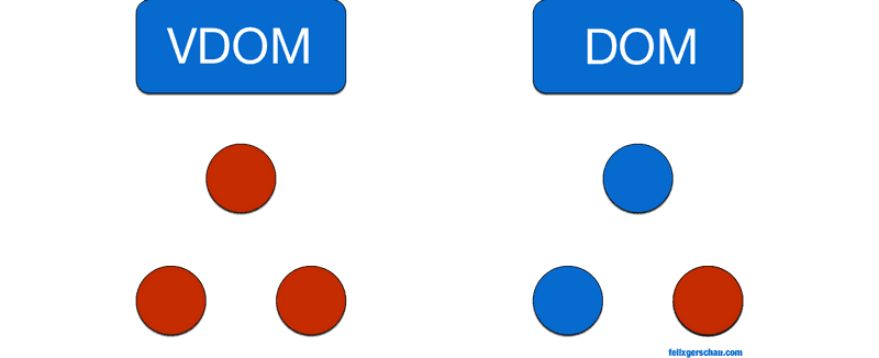 - The red dots represent updates of the DOM tree. Updating the VDOM doesn't necessarily trigger an update of the real DOM.