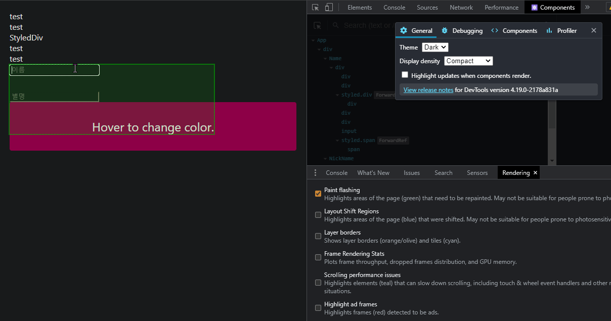 - 크롬 개발자도구에서 More tools -> Rendering -> Paint flashing. 로 확인한 결과 styled-components는 react dev tool에선 re-rendering되는 것 처럼 보이지만 실제론 re-rendering 되지 않았다.