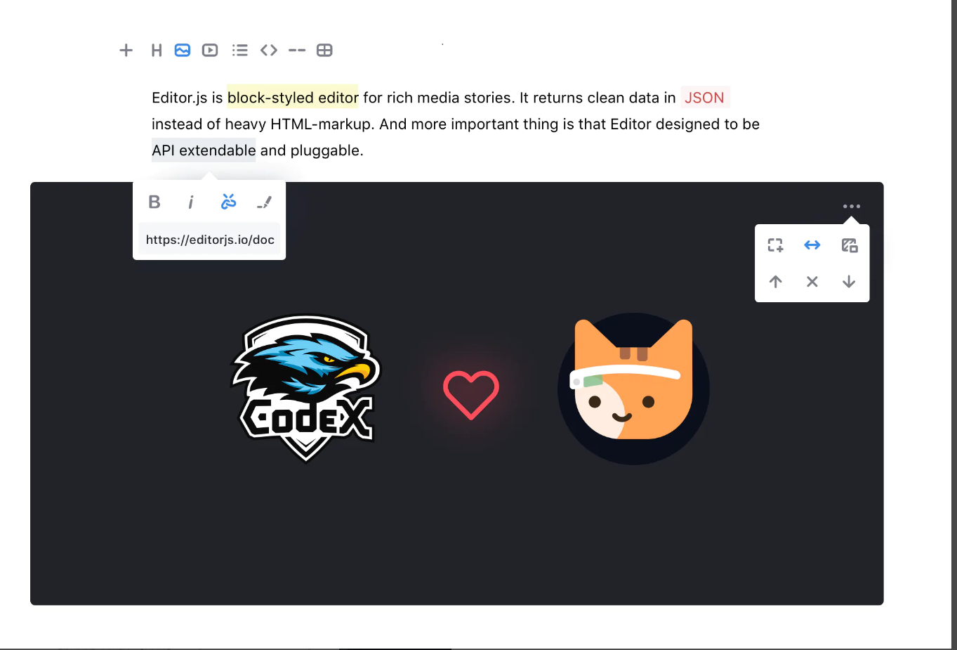 - Editor.js는 API(응용 프로그래밍 인터페이스) 덕분에 확장 및 연결 가능하도록 설계되었습니다. 또한 JSON 출력 형식으로 깨끗한 데이터를 반환합니다.