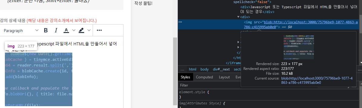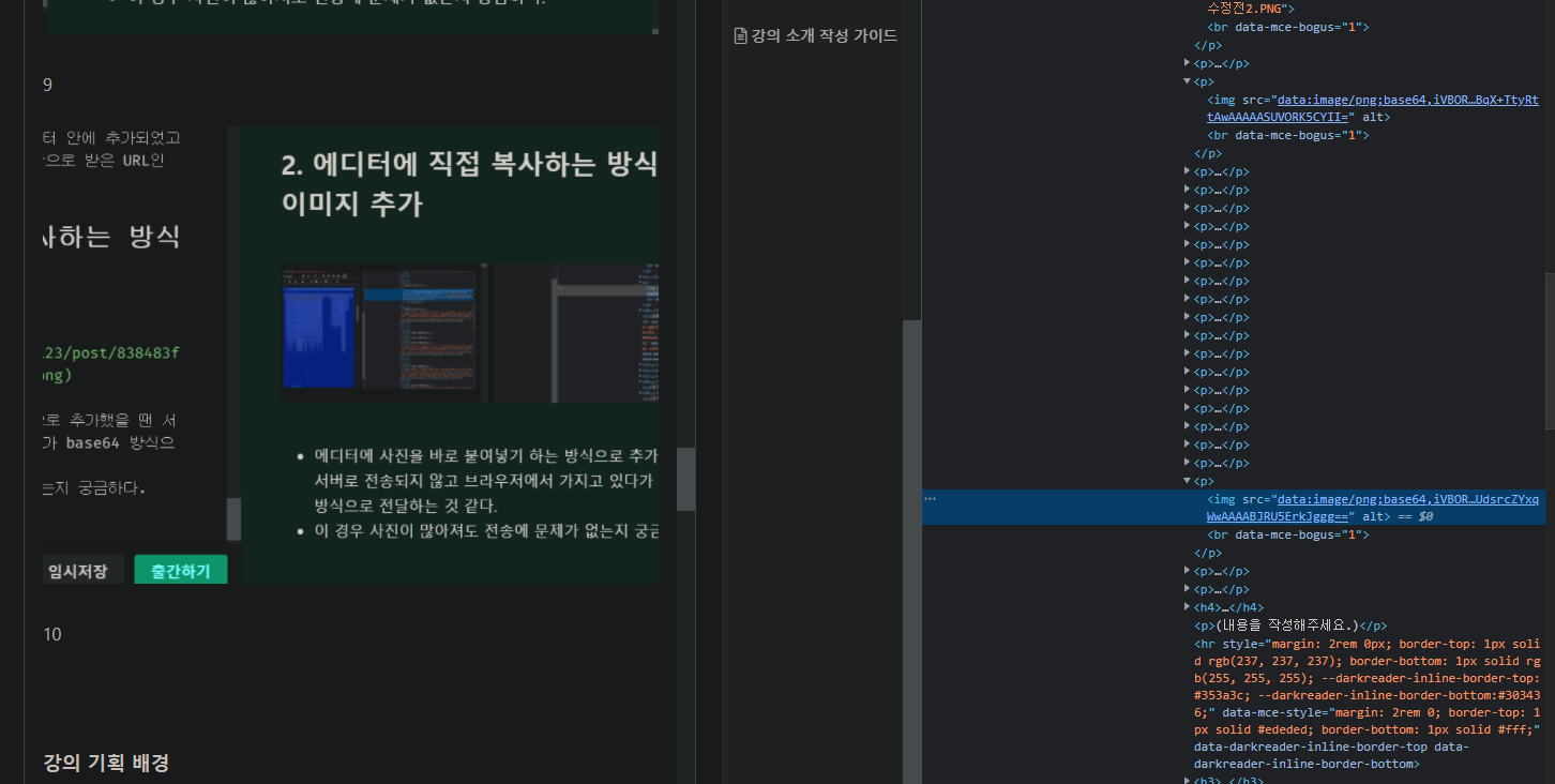 - 아이콘을 통해 이미지를 추가 하거나 이미지를 에디터에 직접 붙여넣기 해서 추가하거나 모두 img 태그의 src에 blob형태로 추가가 되는 것 처럼 보였다. 그런데 서버로 직접 전송을 해보니 base64로 변환되어 전송이 되는 것을 확인했다.