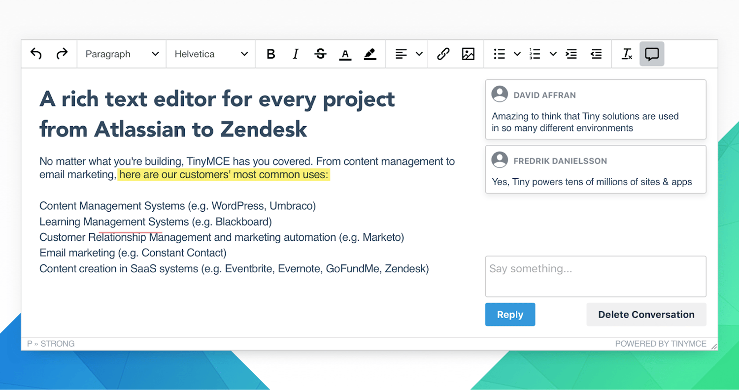 - 이 편집기는 완전히 사용자 정의할 수 있고 더 풍부하고 대화형 콘텐츠를 지원할 수 있기 때문에 개인이 소규모 프로젝트와 Fortune 500대 기업 모두에서 사용합니다.
