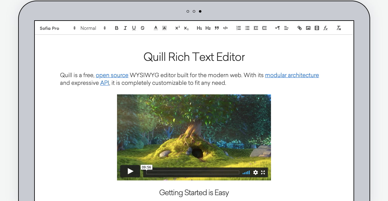 - 모듈식 아키텍처와 표현형 API 덕분에 Quill 코어로 시작한 다음 모듈을 사용자 정의하거나 필요에 따라 이 서식 있는 텍스트 편집기에 고유한 확장을 추가할 수 있습니다.