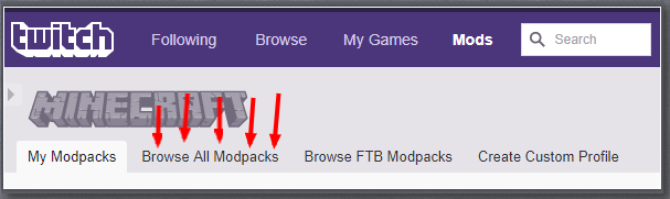 Nyní klikneme na "Browse All Modpacks / Procházet Modpacky"