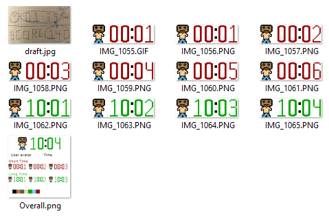The clock uses the elements as same as the background, for example, building. The pointer of the clock uses the shape of the main characters in the game, which makes the clock and the game more uniform in design. The dial options are white and grey to distinguish it from the background colour. At the same time, the hands of the clock move once a second, just like in real-time.