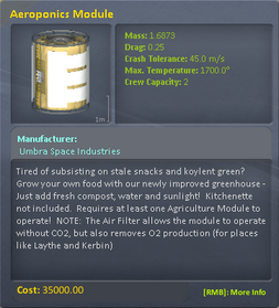 The Aeroponics Module houses the equipment for performing basic life support functions for your Kerbals. Here you can purify Carbon Dioxide into Oxygen, and turn Waste Water back into fresh Water. It's designed to work in conjunction with the Kerbitat, and can take compost (produced by the Kerbitat) and turn it into BioMass.