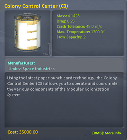 The Colony Control Centre is the central hub of any new station or base. It generates the punch cards that all the other modules require to operate. It only has one function: To serve as a command module for the rest of your base or station.