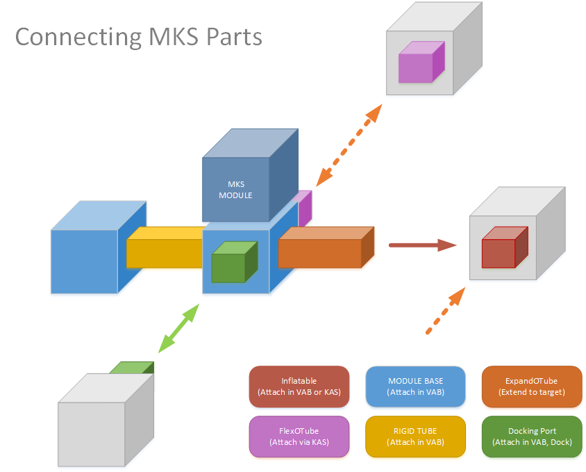An MKS Base requires the same basic modules, but can be more difficult to set up, requiring some EVA assembly with the use of KAS. The required equipment for a base supporting ten Kerbals is as follows:
