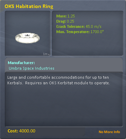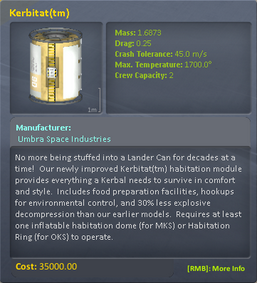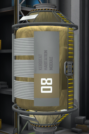 The Kerbitat, and associated habitation modules, are where your Kerbals will spend most of their spare time. There are facilities for Kerbals to relieve themselves when the situation requires, and basic cooking and food preparation. For obvious reasons these facilities are kept separate from one another. The waste collected is stored internally and turned into compost for supply to the Aeroponics module. Additionally, any edible plants supplied from the Aeroponics module can be prepared in the modest kitchen included. Like the Aeroponics module, the Kerbitat requires at least one Habitation module to operate.