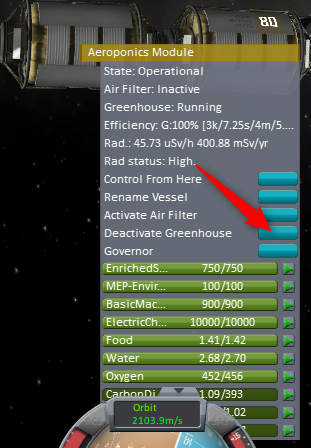 Activate the Greenhouse (converts Compost to Biomass and CO2 to Oxygen) The Air Filter is not needed in an Orbital Station but is part of the module as it can be used on ground stations. It allows the unit to operate without CO2 but no longer produce oxygen for places like Kerbin.