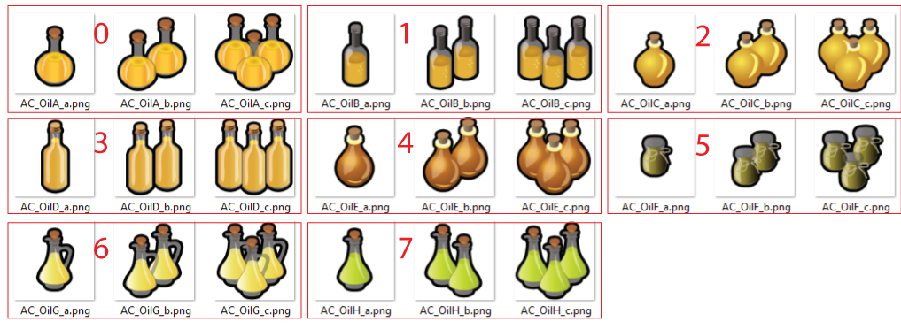 Furthermore, new entries can be patched into a VEF.Graphics.GraphicOffsets, that's why there are more oils in that image, as patches for different VE mods will insert Avocado with a value of 7 (the last group of three, greenish), olives and canola, for example.