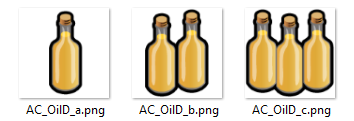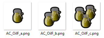 <graphicClass>VEF.Graphics.Graphic_StackCountByIngredient</graphicClass>Secondly, you'll need to make a list of ingredients and their offset in an image's folder to tell the graphic class which graphic to choose. For example, this is the custom def for oil in Alpha Crafts: