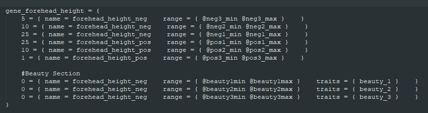 If you wonder how to find out Gene_Name and Gene_Variation, open mod\Warcraft-Guardians-of-Azeroth-2\common\ethnicities\00_ethnicities_templates.txt. That's the file of the basic human template we talked about. It has one nice feature, it has ALL genes listed. So it's possible to find out the real gene name. Usually, it has the same keywords the gene has in the Ruler Designer so it should be easy.