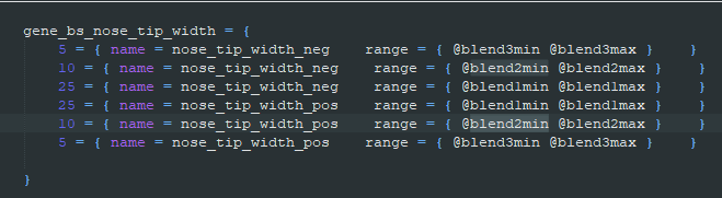 0to1.1of the negative means 0% the Ruler Designer's slider.1of the positive means 100% the Ruler Designer's slider.0of both variations means 50% of the Ruler Designer's slider. In00_ethnicities_templates.txtthese genes have@blend3min,@blend1max,@blend2min, in theirranges.
