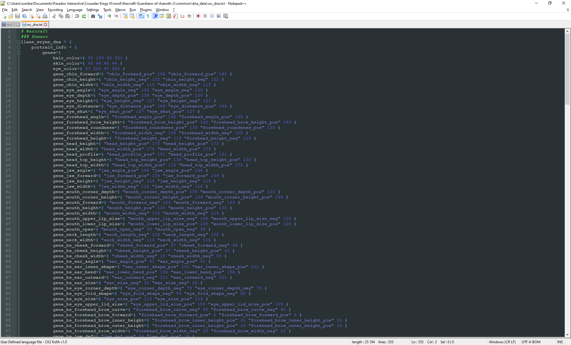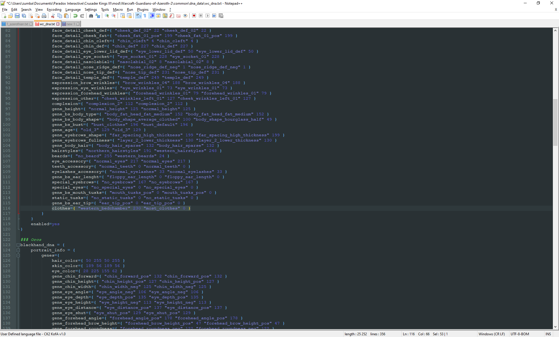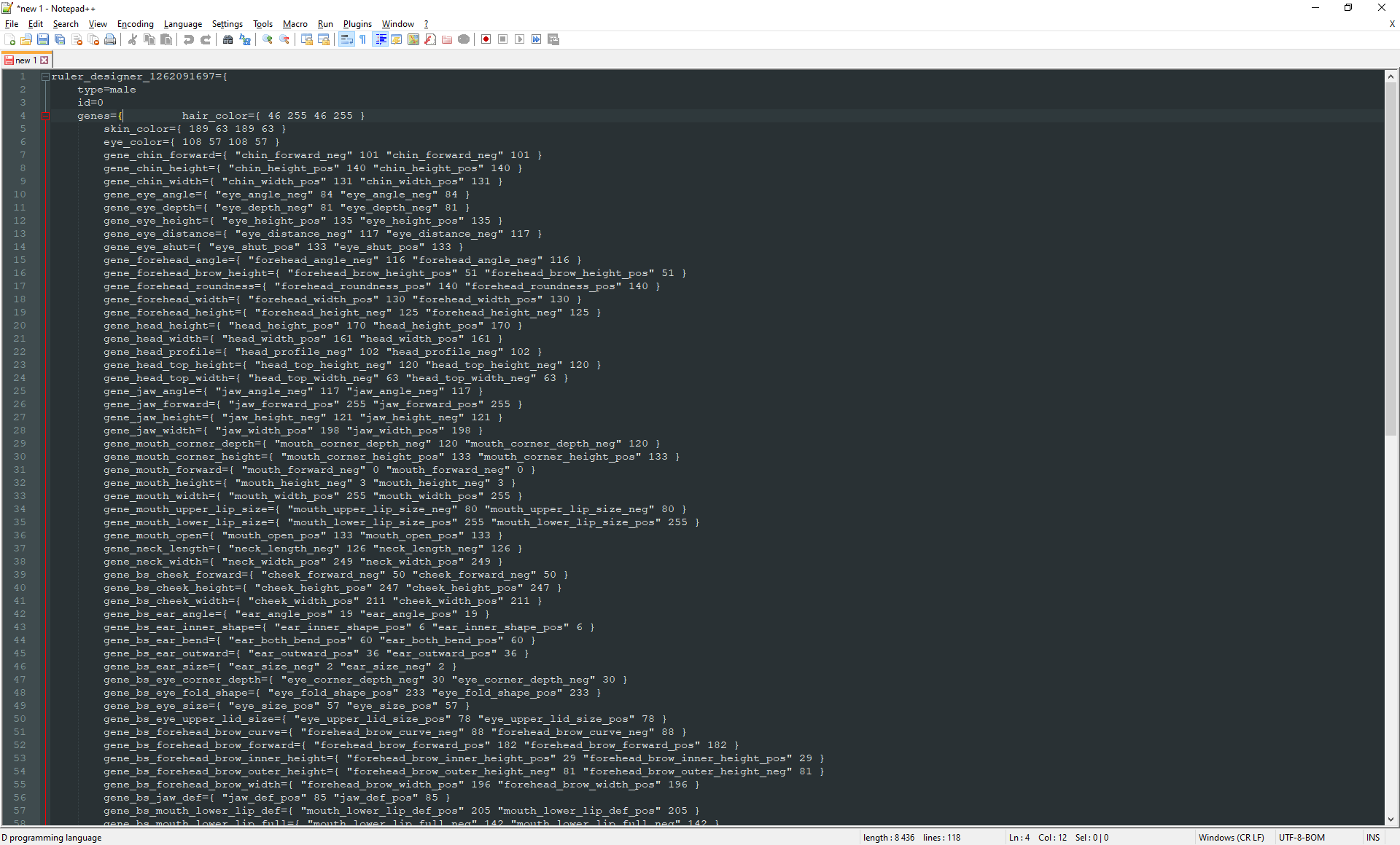 genesenclosed block. If you use Notepad++, it will highlight where this block opens and closes once you click near a brace like on the screenshot above. YOU MUST COPY THE ENTIRE BLOCK, FROM THEgenesTO THE CLOSING BRACE. - Open the suitable file (each race has its own file there) in