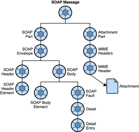 SOAPMessage soapMsg; SOAPPart soapPart = soapMsg.getSOAPPart(); SOAPEnvelope soapEnv = soapPart.getEnvelope(); SOAPHeader soapHeader = soapEnv.getHeader(); // soapMessage.getSOAPHeader(); SOAPBody soapBody = soapEnv.getBody(); // soapMessage.getSOAPBody() Iterator attachments = soapMsg.getAttachments(); while (attachments.hasNext()) { javax.xml.soap.AttachmentPart attachmentPart = (AttachmentPart) attachments.next(); ... } |