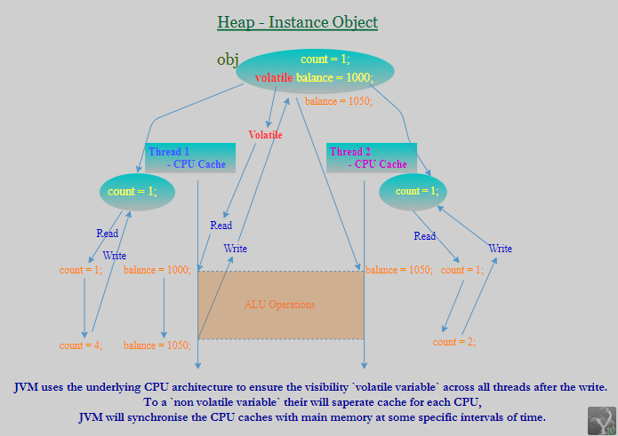 Volatile: Applicable to variables If we do not declare variables as volatile then every thread will have their own copy. If T1 changes the value, T2 canot access the updated value which may lead to "Data-Inconsistency" [Ex: Bank amount transfer form one account to another] Similar to Static variable(class level-Method Area) but volatile applicable of instance objects(Instance-Heap Area).