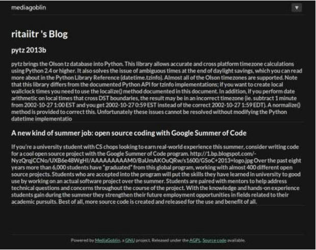 I am interested in MediaGoblin’s blogging system project, since MediaGoblin is also selected for Google Summer of Code floating the same project I will definitely apply for GSoC.