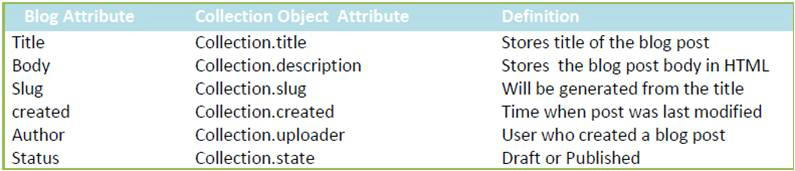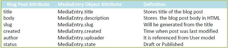 We will model blog post as a MediaEntry instance like videos, audios etc. The table below shows the mapping of the attributes of our blog post to their corresponding attributes in a MediaEntry object.