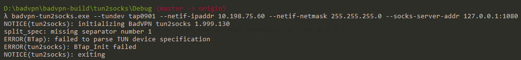 badvpn-tun2socks.exe --tundev "tap0901:adapterName:10.0.0.1:10.0.0.0:255.255.255.0" --netif-ipaddr 10.0.0.2 --netif-netmask 255.255.255.0 --socks-server-addr 127.0.0.1:1080window adapterName is