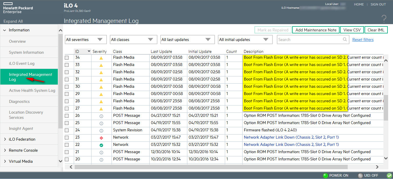 Again, you can retrieve useful informations from "Integrated Management Log" on the iLO server console.