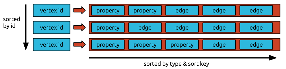 Titan stores each adjacency list as a row in the underlying storage backend. The (64 bit) vertex id (which Titan uniquely assigns to every vertex) is the key which points to the row containing the vertex’s adjacency list. Each edge and property is stored as an individual cell in the row which allows for efficient insertions and deletions.