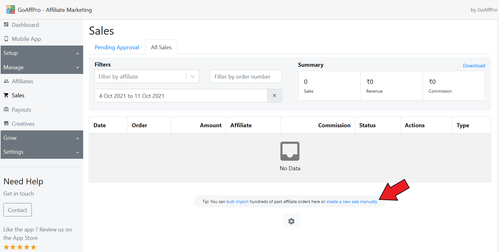 To create a new sale for an affiliate, you can go to the Sales > All Sales tab > Click on Create a new sale manually > Click on Manually create an order