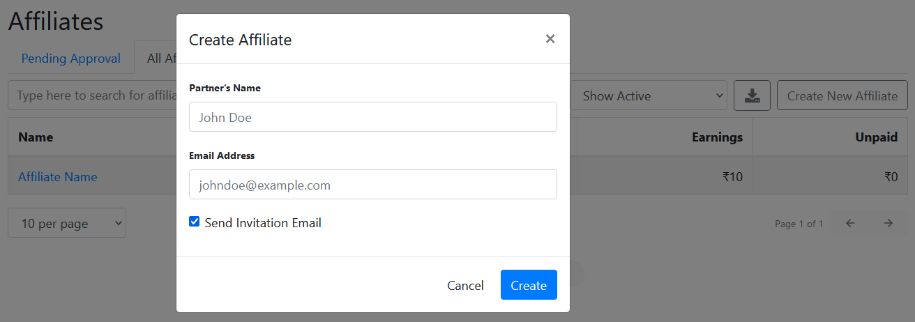 For doing this, you can go to the Affiliates > All Affiliate tab > Click on Create New Affiliate