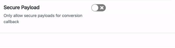 }You can also send encrypt the payload before you send it to goaffproTrackConversion() function. Turn on Secure Payloads in the Settings -> SDK Settings tab of the admin dashboard