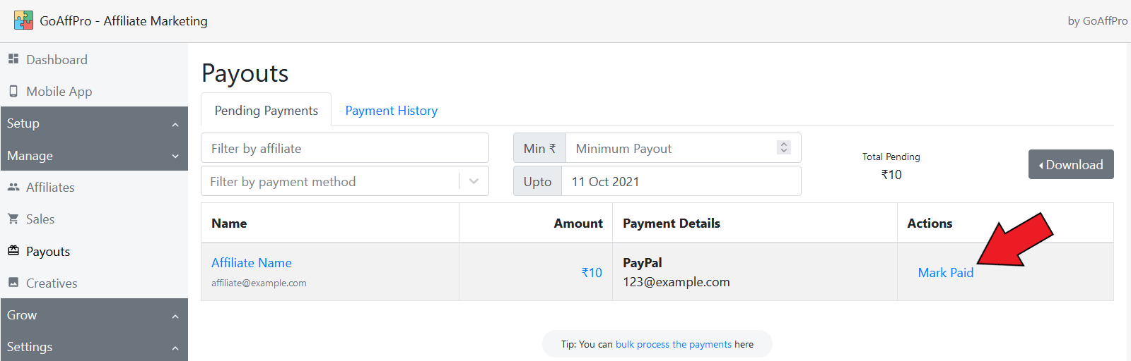 To do this, you can go to the Payouts > Pending Payments tab > Click on Mark Paid (you will be doing this after you make the payment to the affiliate outside of the app)