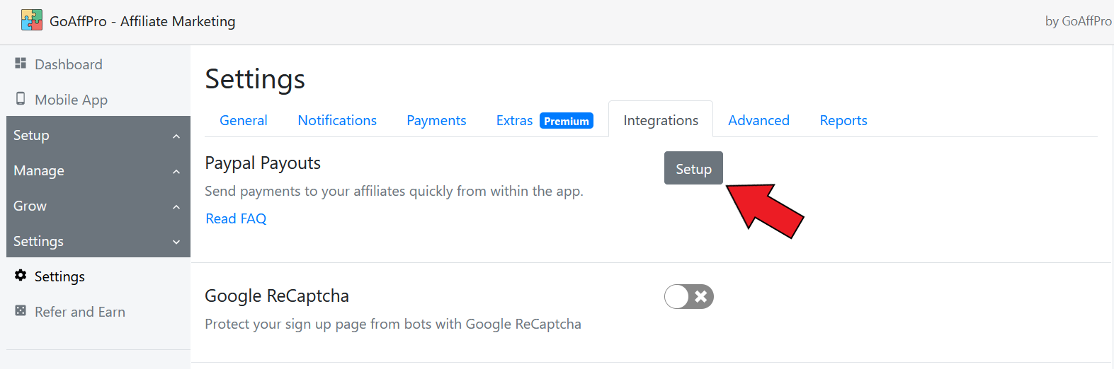 You can integrate PayPal Payouts from the Settings > Integrations tab > PayPal Payouts > Click on Setup and go through the integration process.