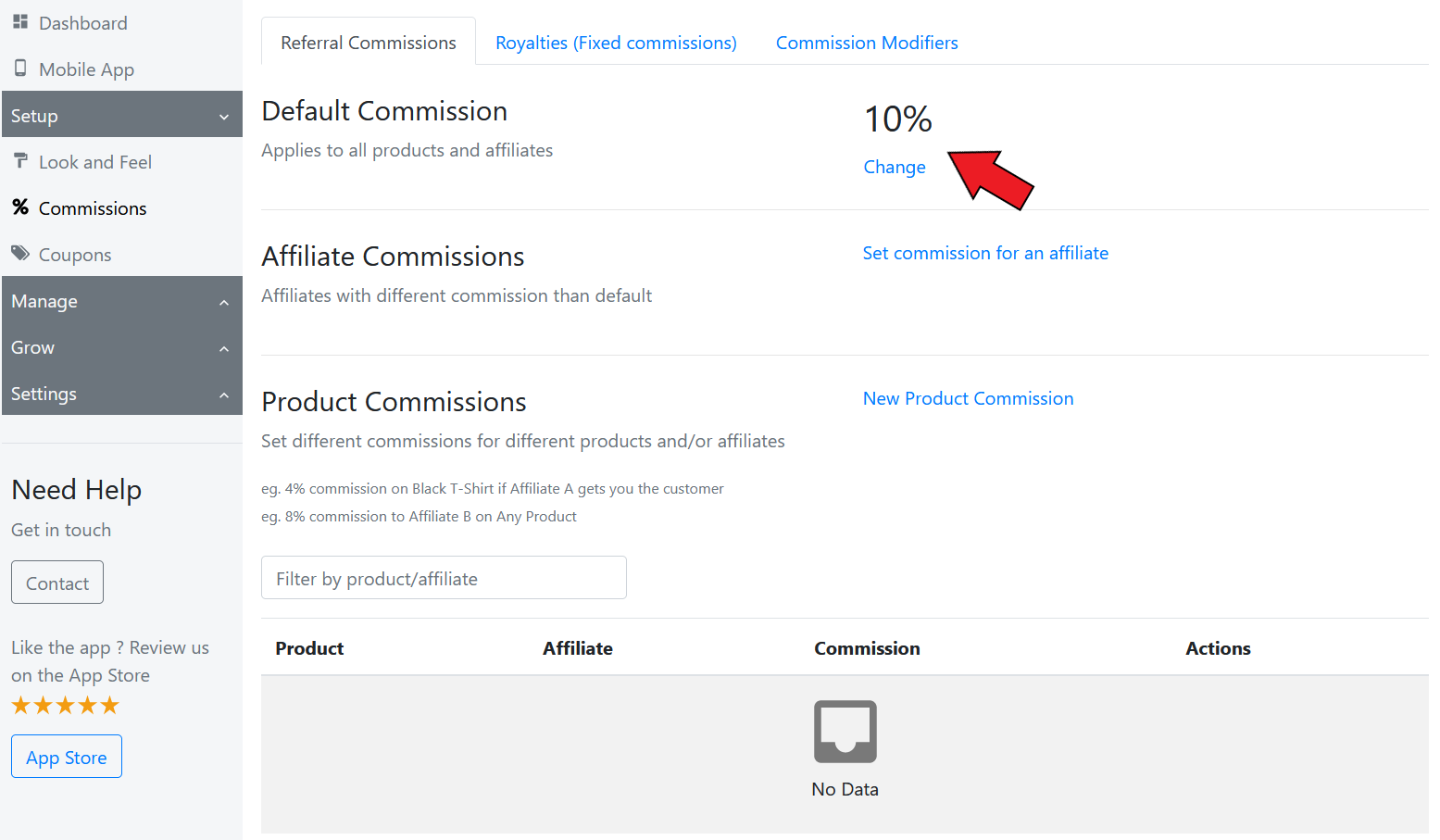 Click on Change and set the commission rate. You can also set a flat rate commission (and apply it on the entire order or each item)