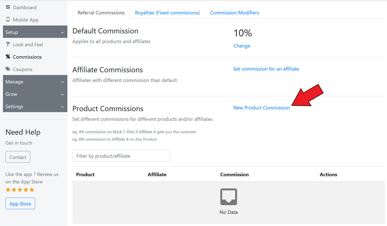 The product commission option allows you to set up different commission rates for different products. You can click on New Product Commission to set up commission rates for products.