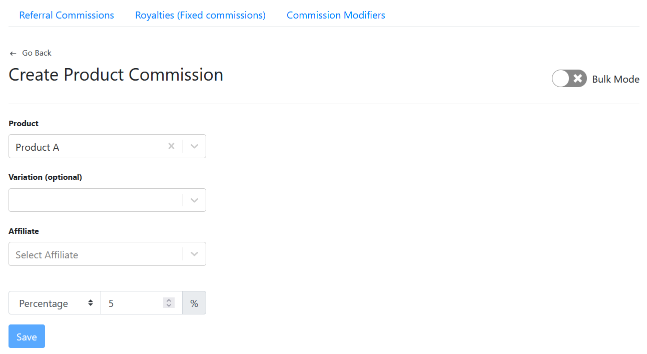 You can also set a specific product commission for an affiliate (by selecting an affiliate's name). There is also an option to select variants and set up rates for them.