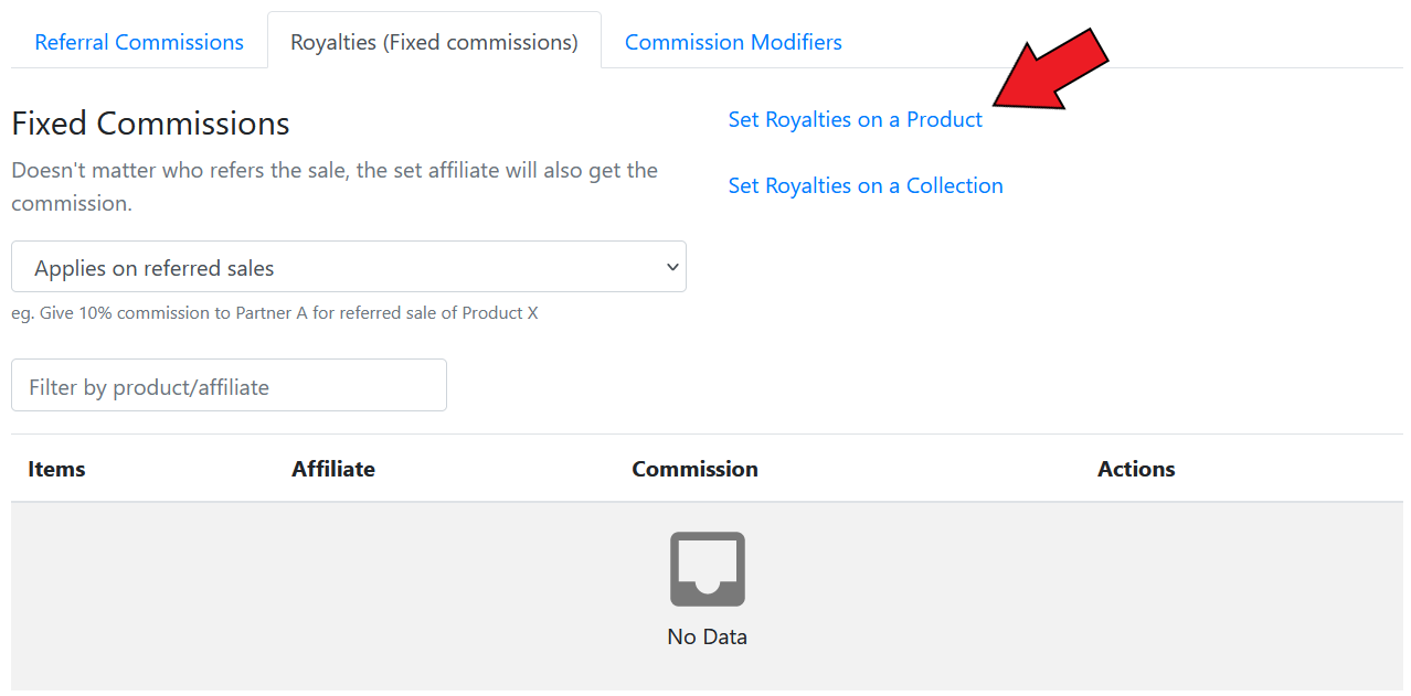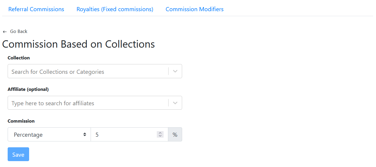 Here, you can select the collection, and set the commission rate for it. (You can also select the affiliate if you want to set a specific collection commission rate for an affiliate)