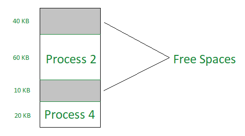 Lets consider a memory space having 4 processes, process 1 (40kb), process 2(60kb), process3(10kb), process 4(20kb) .