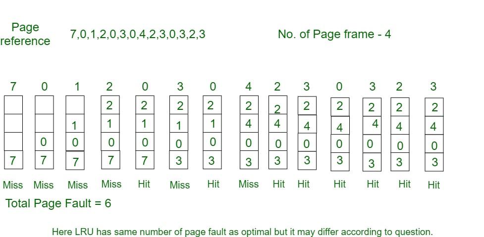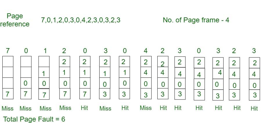 Consider the page reference string 7, 0, 1, 2, 0, 3, 0, 4, 2, 3, 0, 3, 2, 3 with 4 page frames.
