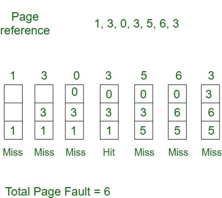 - Initially, all slots are empty: 1, 3, 0 → 3 Page Faults.