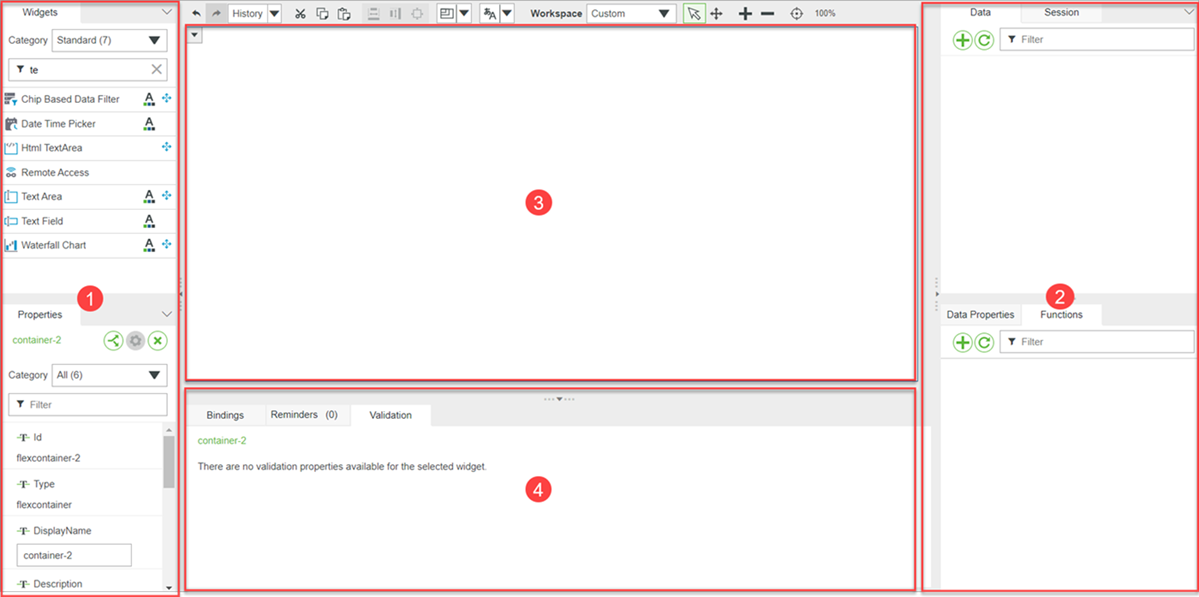 Properties, change name, drag bindings for actions etc. e.g. grid row select event, date picker formats etc.
