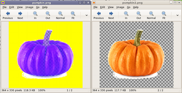 20151031a: Autoplot is misused (left) and used (right) to make the white background in a pumpkin image transparent. Here is the script.